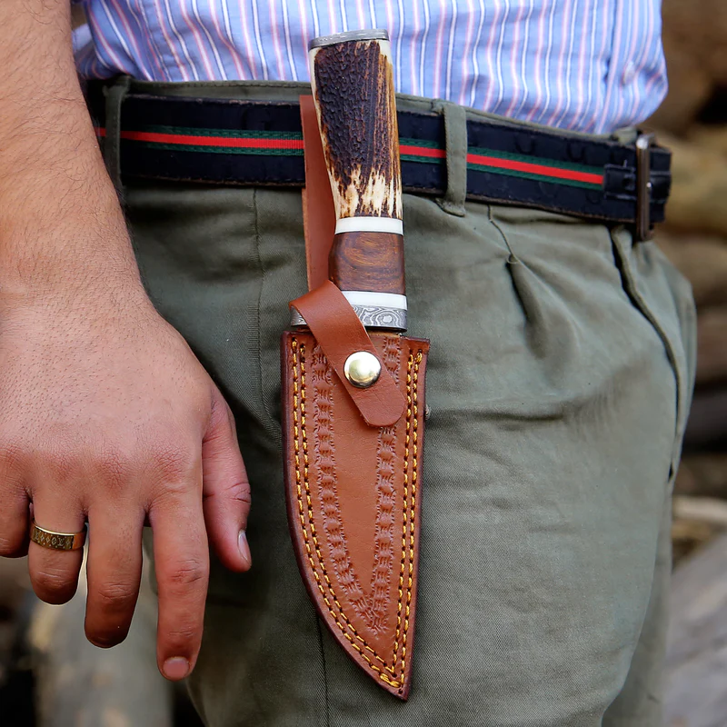 9″ Damascus Steel Skinner Hunting Knife – Stag Horn Handle with Leather Sheath
