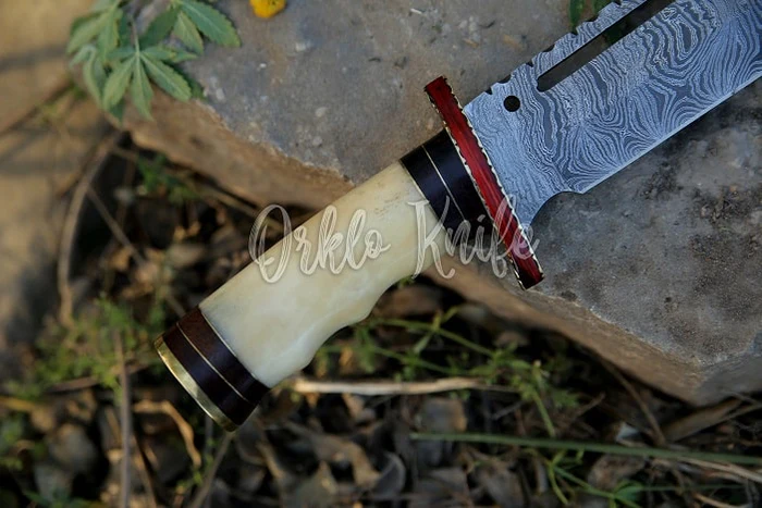 Daud Blades SK-40 – Handmade Damascus Hunting/Utility Knife | 8″ Overall, 4″ Blade | Colored Bone Handle + Leather Sheath