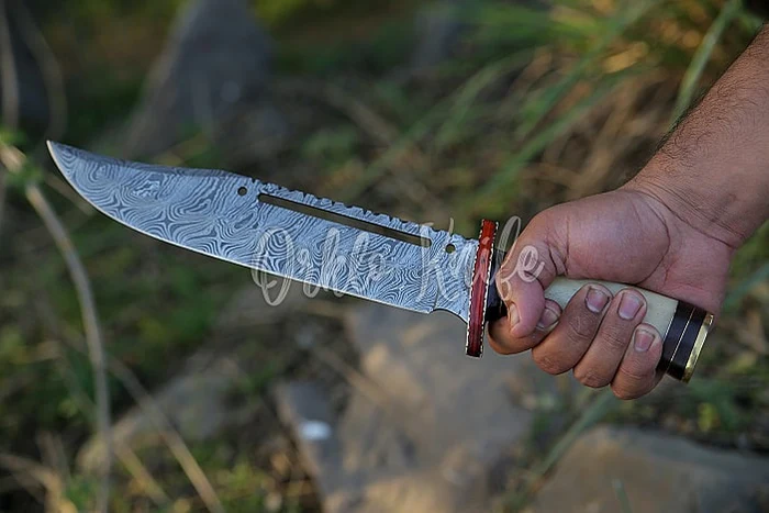 The natural white bone handle, accented with a brass guard and pommel, offers durability, balance, and a comfortable grip. Measuring 13 inches overall, this Bowie knife excels in hunting, survival, and outdoor adventures while also serving as a stunning collectible.