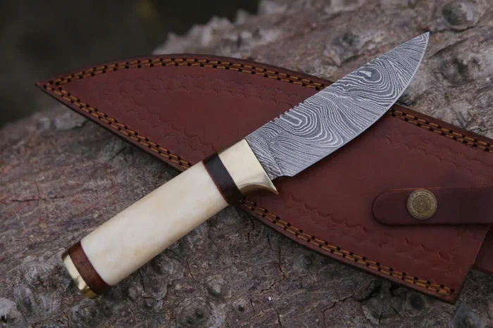 - Blade: Hand-forged Damascus steel, 5″ razor-sharp twist pattern blade (HRC 55–58)
