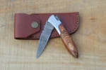 Daud Blades Hand-Forged Damascus Folding Knife – Olive & Red Wood Handle, Stainless Steel Clip, Leather Sheath