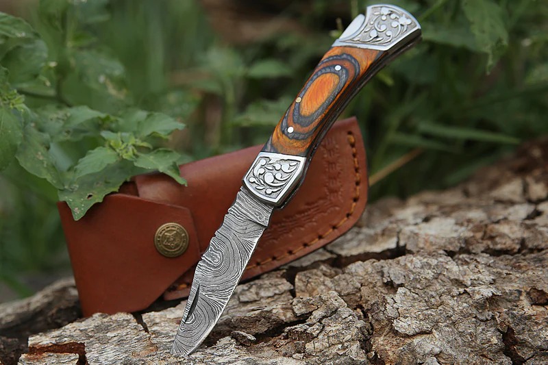 Daud Blades Hand-Forged Damascus Folding Knife – Olive Wood & Grey Pakka Handle, Stainless Steel Bolster, Leather Sheath