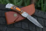 Daud Blades Handmade Damascus Folding Knife – Blue & Olive Wood Handle with Leather Sheath