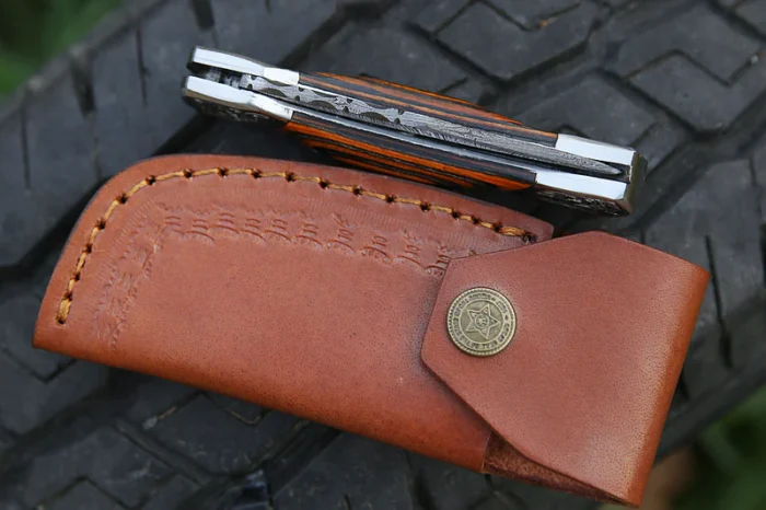 Daud Blades – Hand Forged Damascus Folding Knife | Rosewood & Olivewood Handle, Stainless Clip, Leather Sheath