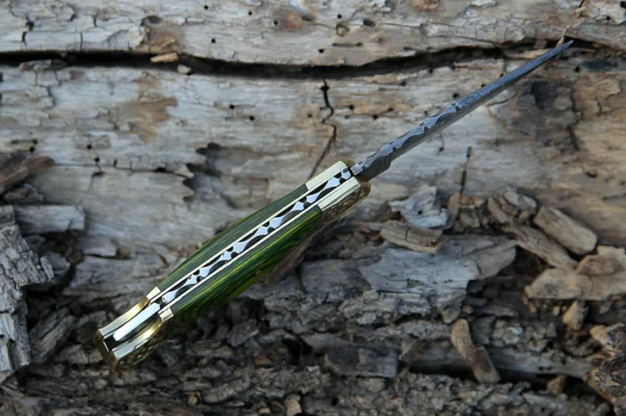 - Elegant Handle Design – Green wood handle secured with brass pins on steel inlay.