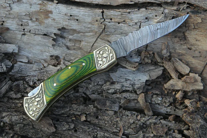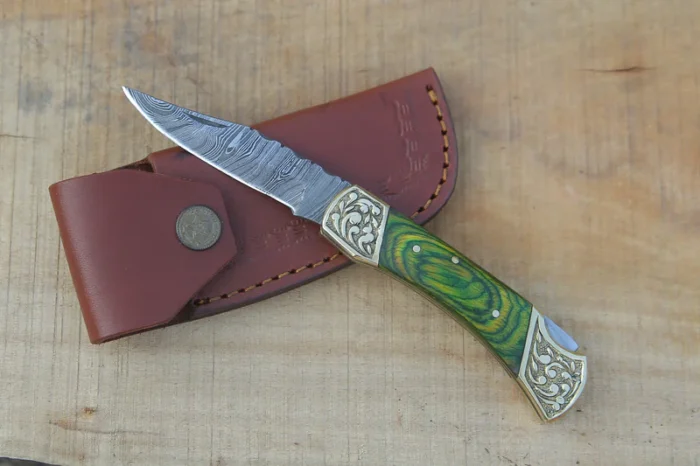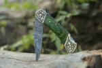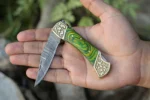 Be the first to review “Daud Blades – Hand Forged Damascus Folding Knife | Green Wood Handle, Engraved Stainless Clip & Leather Sheath” Cancel reply