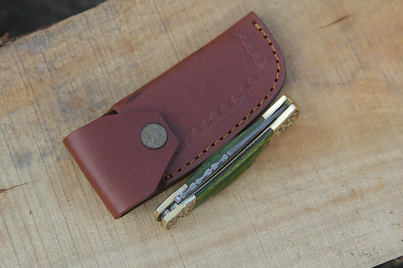 Daud Blades – Hand Forged Damascus Folding Knife | Green Wood Handle, Engraved Stainless Clip & Leather Sheath