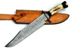 Handmade Damascus Hunting Knife – 13″ Bowie Knife with Horn & Rosewood Handle + Leather Sheath | Camping & Survival Knife