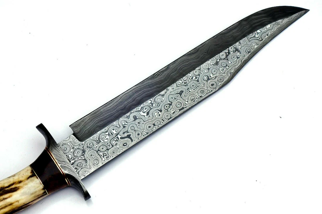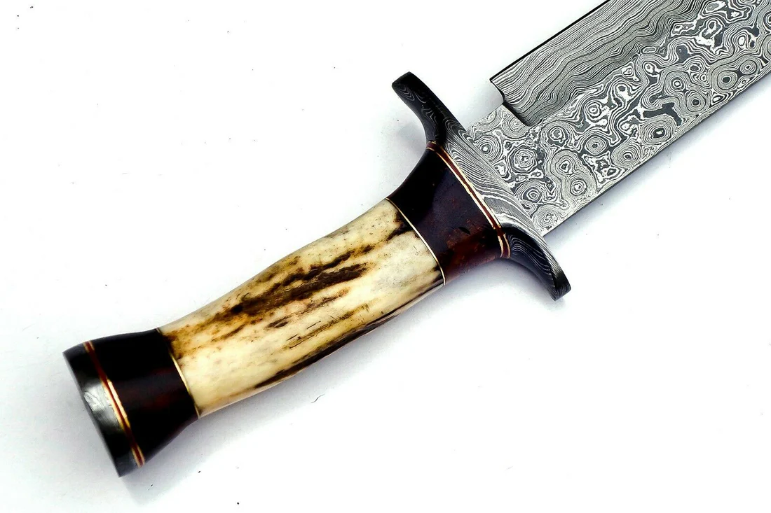 Daud Blades Handmade Hunting Bowie Knife – 15″ Damascus Steel Blade with Elk Horn & Damascus Handle + Leather Sheath