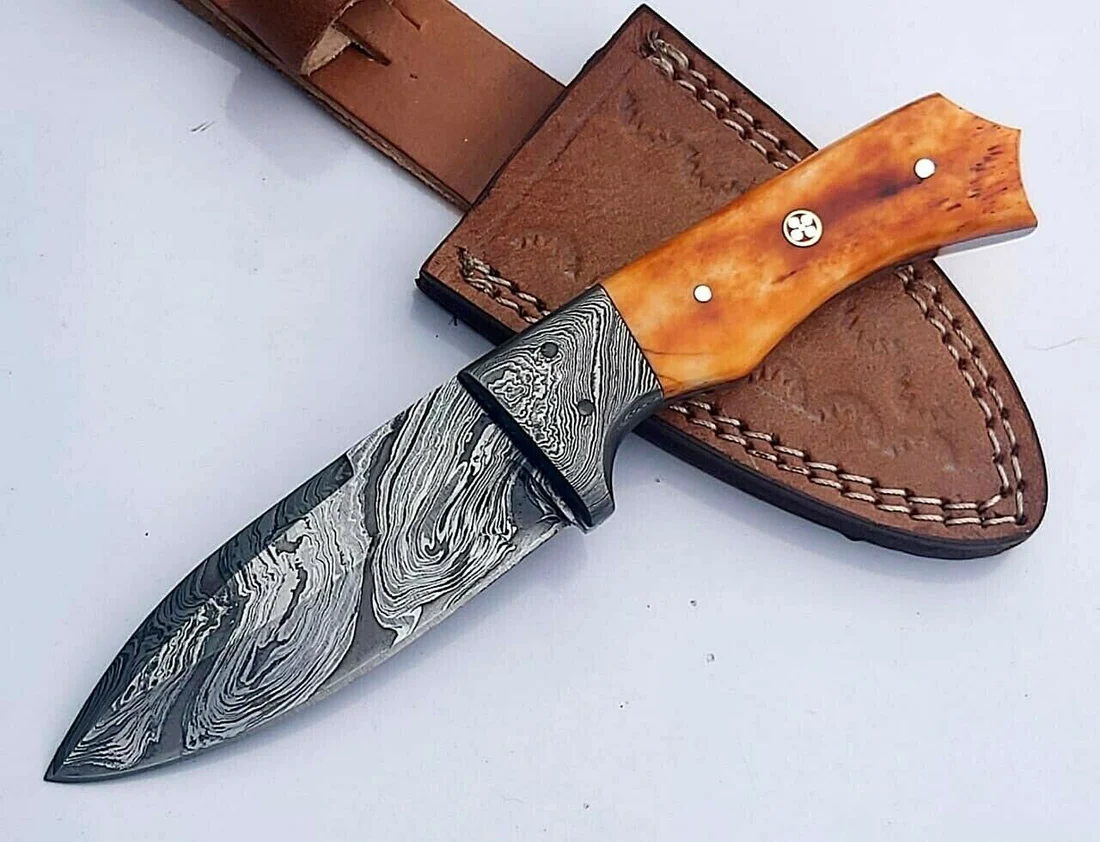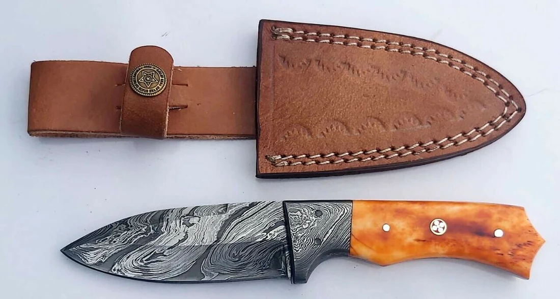 Compact, razor-sharp, and beautifully crafted, the Daud Blades SK-40 is a handmade Damascus steel knife designed for hunting, camping, fishing, and everyday outdoor tasks. Its patterned Damascus blade pairs with a colored bone handle for a balanced, comfortable grip. Includes a handmade leather sheath for secure belt carry.