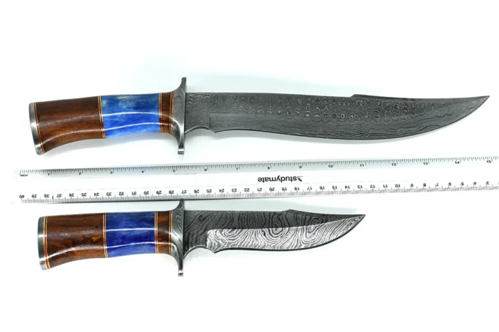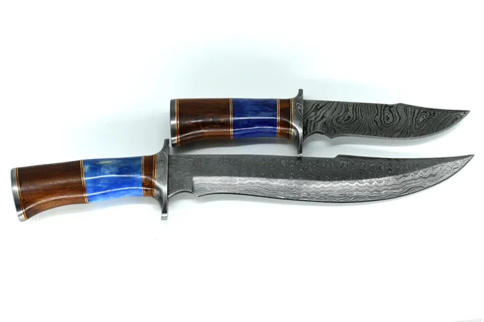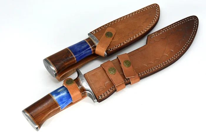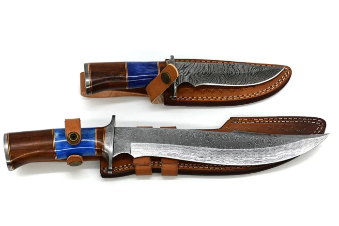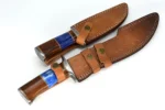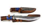 Be the first to review “Handmade Damascus Hunting Knife Set – 15″ & 10″ Bowie Knives with Marindi Wood & Bone Handle + Leather Sheaths” Cancel reply