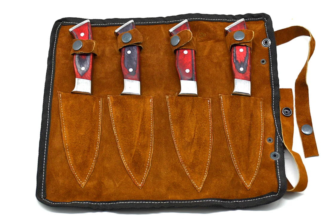 Elevate your dining experience with the Handmade Damascus Steak Knife Set. Featuring 4 razor-sharp 8″ knives crafted from 224-layer Damascus steel with full tang colored wood handles, this set combines beauty, strength, and performance. Complete with a durable leather storage case, it’s perfect for chefs, collectors, or anyone who values premium craftsmanship at the table.