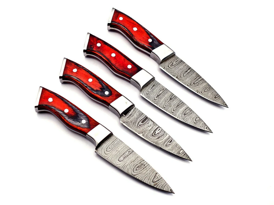 Handmade Damascus Steak Knife Set – 4-Piece 8″ Full Tang Knives with Colored Wood Handles & Leather Case