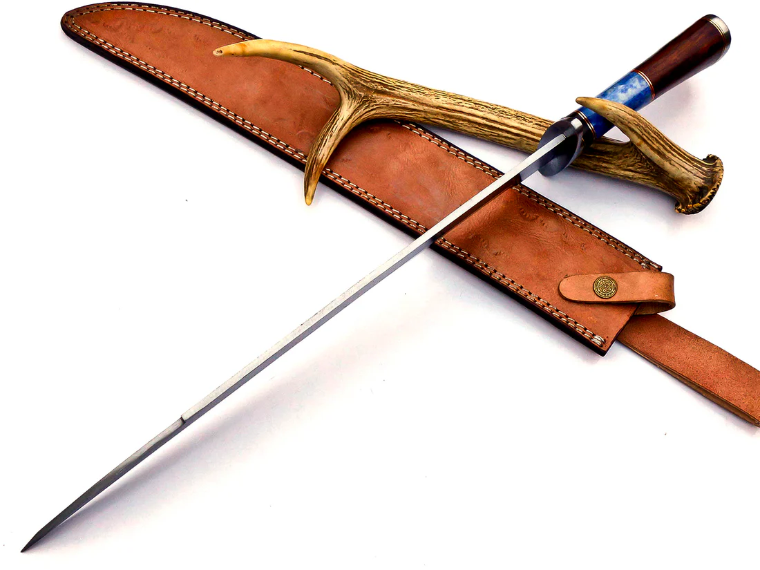 - Unique Stag Horn Handle – Ergonomically shaped with Damascus guard and pommel for grip and elegance.