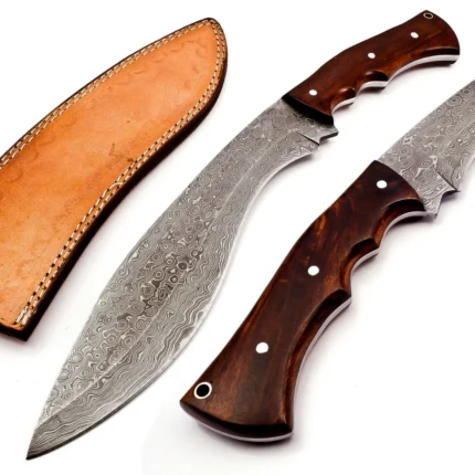 Daud Blades Handmade Kukri Hunting Knife – 15″ Damascus Steel Blade with Rosewood Handle & Leather Sheath